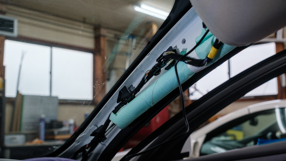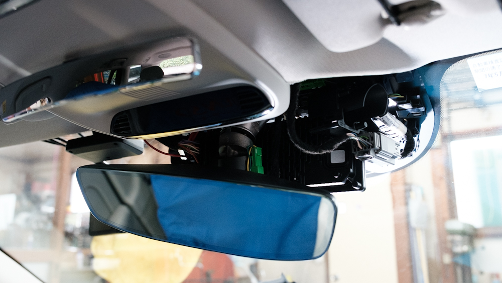 アンテナはフロントガラスに設置するので、ミラー裏のカバー類も外して作業します。