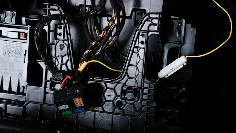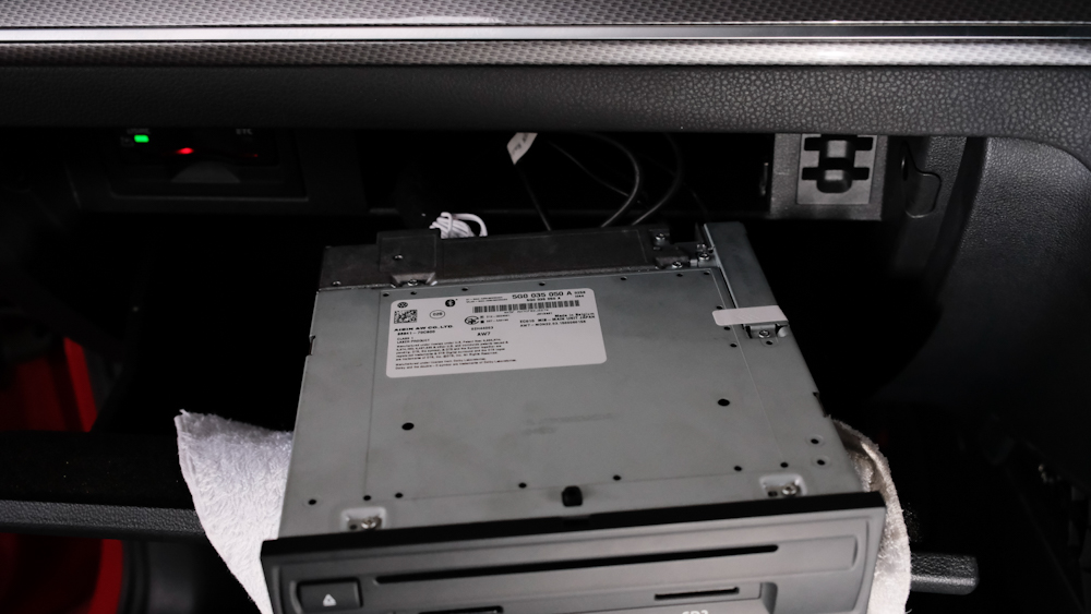 グローブBOX上部の隙間に、配線を誘導しつつ本体を納めていきます。
