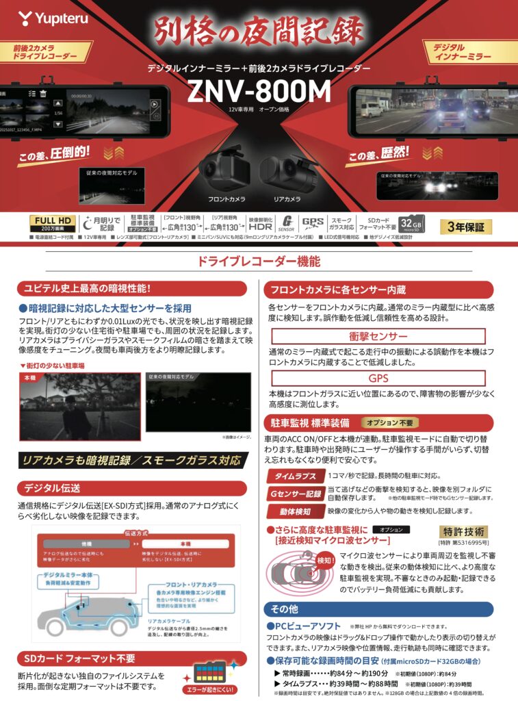 新製品情報:ユピテル製 デジタルインナーミラー+前後2カメラドラレコ「ZNV-800M」登場。